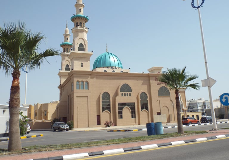 مواقف السيارات: مساحة كافية لمواقف السيارات، مع مراعاة تصميم الطرق الداخلية لتسهيل حركة السيارات والدخول والخروج من المسجد.