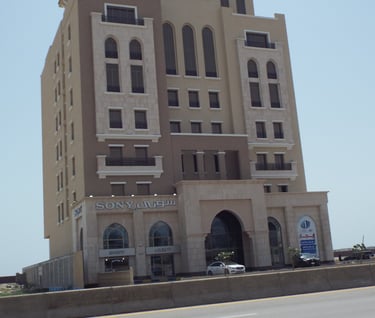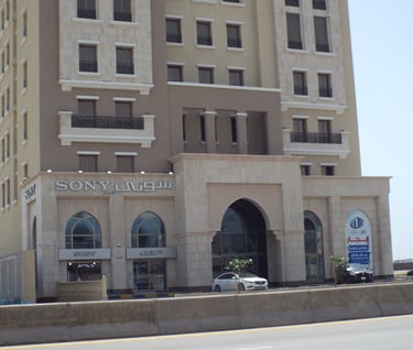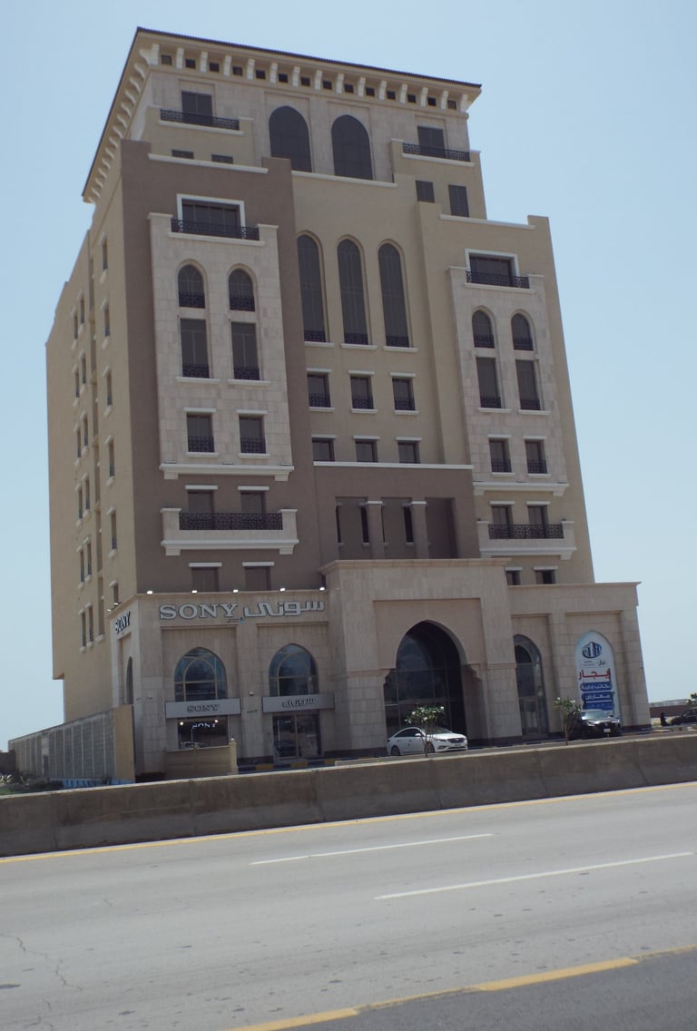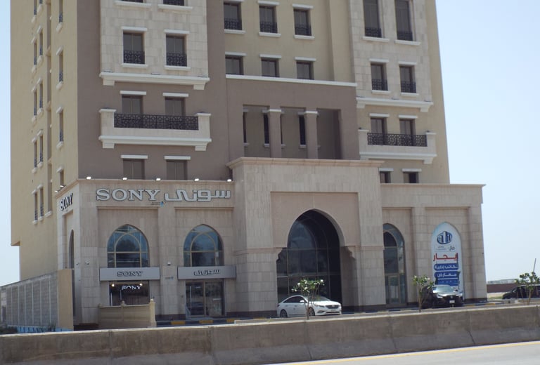الجزء التجاري: الطابق الأرضي يحتوي على واجهات زجاجية كبيرة تعرض محلات تجارية، ومن ضمنها علامة "سوني"، مما يشير إلى وجود متاجر راقية.